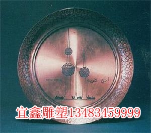 銅雕塔紋圓掛盤是1981年,科威特大塔經(jīng)理贈中國婦女代表團(tuán)。