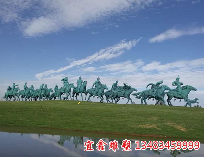 描述:共計15個騎馬人物,和兩只大黃狗。此雕塑規(guī)模浩大,充分表現(xiàn)了迎親隊伍的壯觀景象。