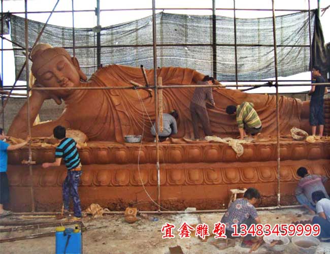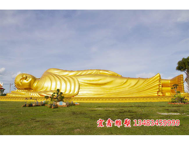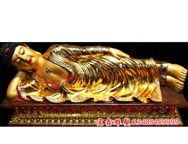 銅雕佛像釋迦牟尼涅盤,梵文音譯,意譯入滅、圓寂等。指除盡煩惱業(yè)報(bào),進(jìn)入不生不死、永久快樂安穩(wěn)的最高理想境界。按照佛經(jīng)說法,釋迦牟尼80歲時(shí),在末羅拘尸那城跋提河邊的娑羅雙樹下涅槃。涅槃像的造像形式為,側(cè)身而臥,雙目微閉,神態(tài)安詳自然,面帶微笑。雙腳伸直并攏,右手支頤,左手自然地放在身體上,衣紋線條圓滑流暢。釋迦涅槃像的題材從北魏一直延續(xù)到清代。